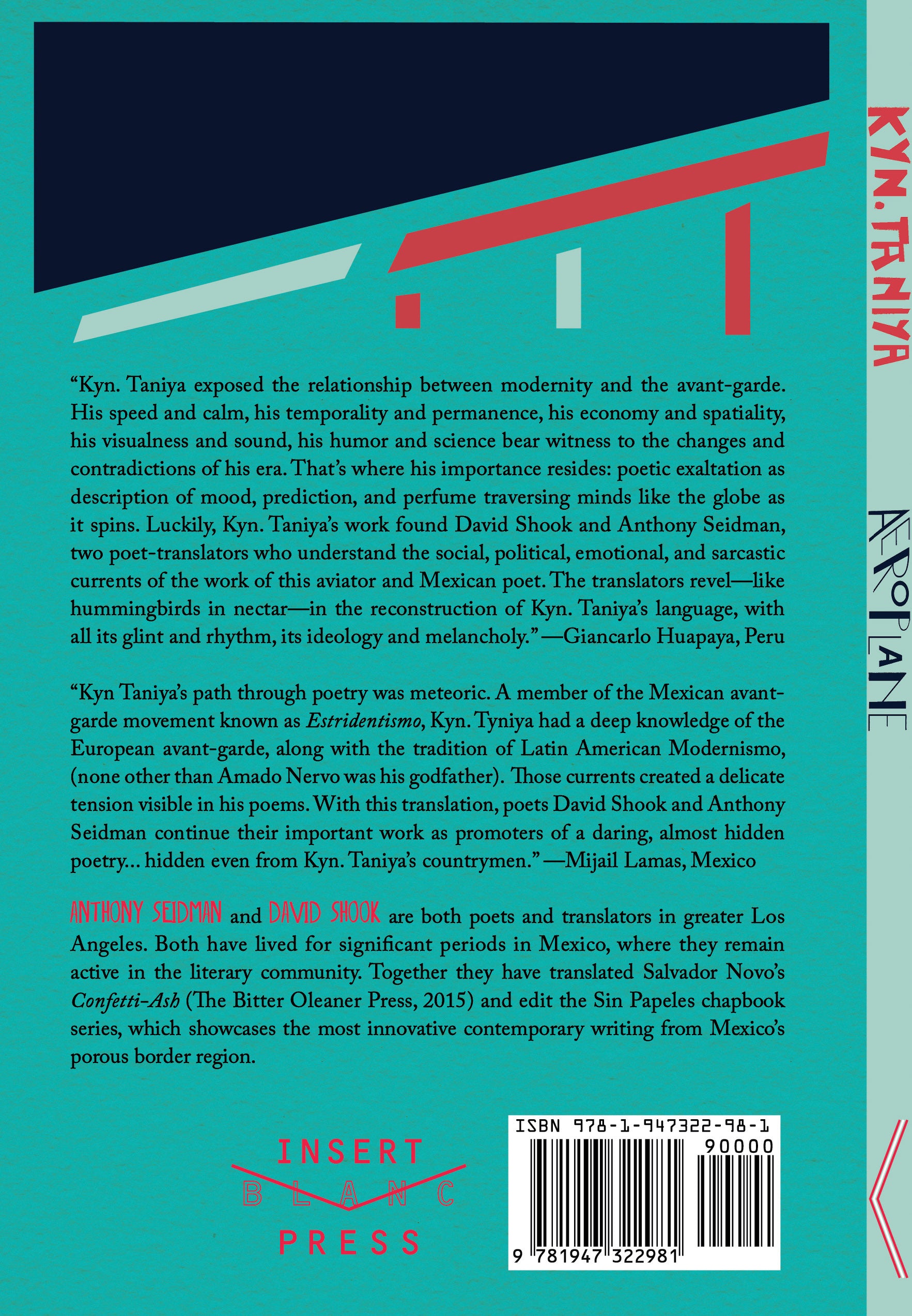“Kyn. Taniya exposed the relationship between modernity and the avant-garde. His speed and calm, his temporality and permanence, his economy and spatiality, his visualness and sound, his humor and science bear witness to the changes and contradictions of his era. That’s where his importance resides: poetic exaltation as description of mood, prediction, and perfume traversing minds like the globe as it spins. Luckily, Kyn. Taniya’s work found [Shook] and Anthony Seidman, two poet-translators who understand the social, political, emotional, and sarcastic currents of the work of this aviator and Mexican poet. The translators revel—like hummingbirds in nectar—in the reconstruction of Kyn. Taniya’s language, with all its glint and rhythm, its ideology and melancholy.” —Giancarlo Huapaya