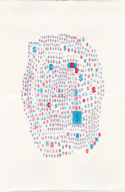 $$$ Cotton Candy – a limited edition of 20 two-color prints available online and at the CREDIT: Installation at Los Angeles Contemporary Exhibitions (LACE) from August 5-26, 2010 (15” x 22” stratford grey rag paper). Quite literally all the Dollars and Cents from the book CREDIT.