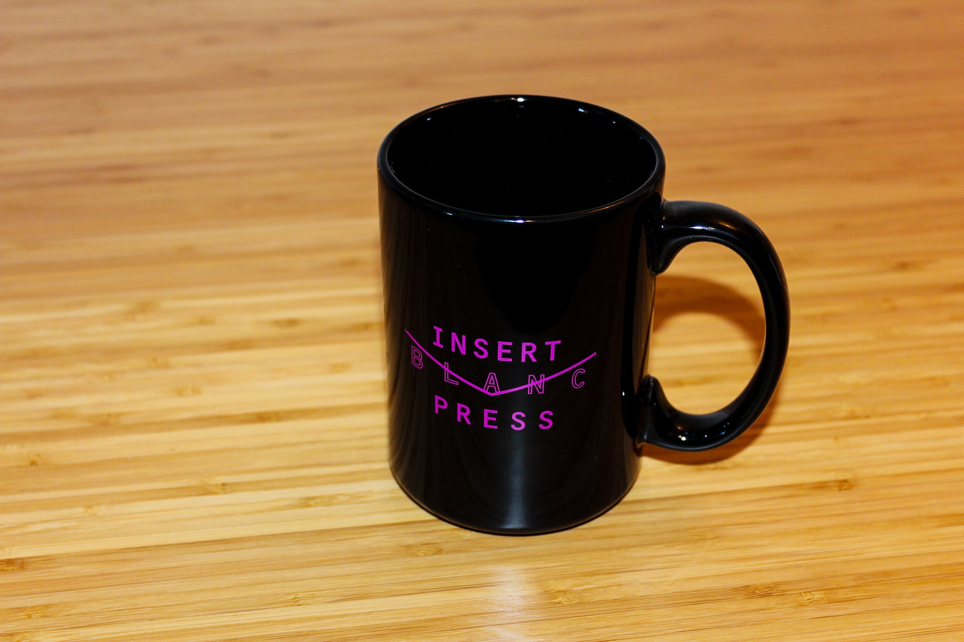 15oz ceramic coffee mug in either white or black, dishwasher and microwave safe.