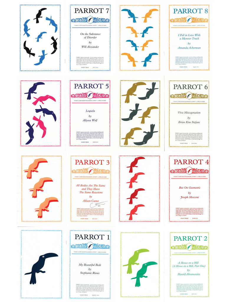 PARROT will print the work of Harold Abramowitz’s A House on a Hill (A House on a Hill, Part One), Amanda Ackerman’s I Fell in Love with a Monster Truck, Will Alexander’s On the Substance of Disorder, Stan Apps’Politicized Pretty Picture, Amina Cain’s Tramps Everywhere, Teresa Carmody’s I Can Feel, Allison Carter’s All Bodies Are The Same and They Have The Same Reactions, Michelle Detorie’s Fur Birds, Kate Durbin’s Kept Women, K. Lorraine Graham’s My Little Neoliberal Pony, Jen Hofer’s The Missing Link, Maximus Kim’s Break Bloom Burn, Janice Lee’s Fried Chicken Dinner, Bruna Mori and George Porcari’s May I take Your Order?, Joseph Mosconi’s But On Geometric, Vanessa Place’s Forcible Oral Copulation, Amarnath Ravva’s Airline Music, Stephanie Rioux’s My Beautiful Beds, Ara Shirinyan’s Erotic in Czech Republic, Michael Smoler’s Pieces of Water, Brian Kim Stefans’ Viva Miscegenation, Mathew Timmons’ Complex Textual Legitimacy Proclamation, and Allyssa Wolf’s Loquela.