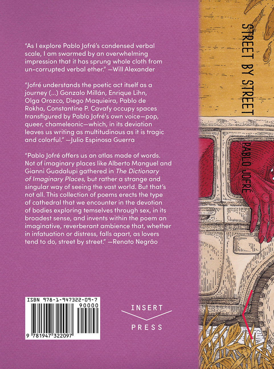 Beginning with an abecedary inspired by Flaubert's 1911 Dictionary of Received Ideas and traversing across a fragmentary travelogue recounting the poet's overland journey from Berlin to Bangkok, the books collected in Street by Street, representing Pablo Jofré's poetic work from 2006 to 2020, chronicle the lived experience of the poetic nomad, heir to the grand tradition of Chile's diaspora writers, from Mistral to Wilms Montt. Praised by Will Alexander, who writes that his "condensed verbal scale" seems to have "sprung whole cloth from un-corrupted verbal ether," Jofré relishes his sexuality, explores the confines of gender, and embraces his status as a literal alien with alternating melancholy and amusement. Translated by Shook, whose own work Jofré has translated into Spanish, these poems take on a new life in English, "euphoric from so much karaoke." Jofré's lyric rises like "sugared vocables" to the reader's ear and leaves you desperate for a nibble.